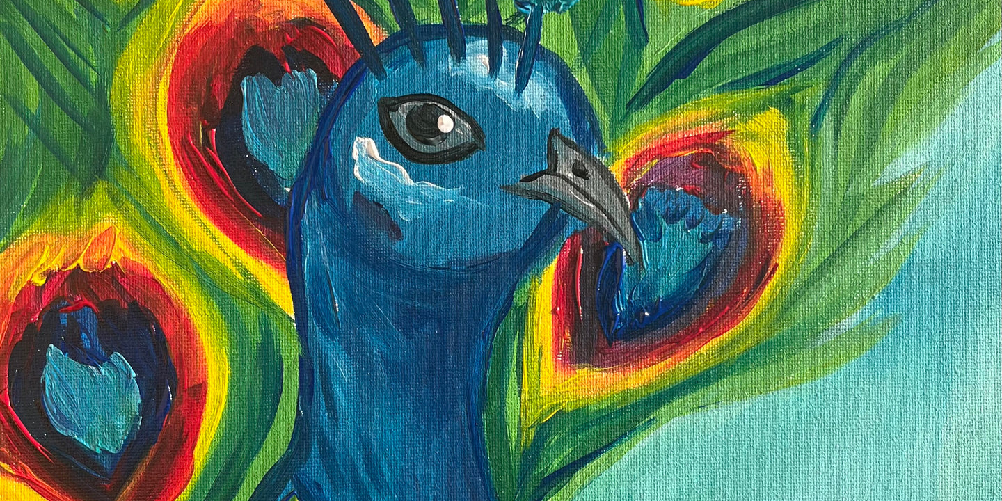 Pretty Peacock (pictured above) is hot off the press! It uses loose, abstract brush strokes to create a soft, yet bold work. The vibrant red and yellow contrast beautifully with the cool blues and green, ending up with what we think is a pretty stunning work of art!